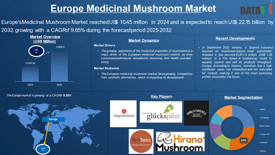 AUSTIN, TX, UNITED STATES, November 14, 2025 /EINPresswire.com/ -- According to DataM Intelligence, the Europe medicinal mushroom market was valued at approximately USD 10.45 billion in 2024 and is projected to reach around USD 22.15 billion by 2032, registering a robust CAGR of about 9.85% during the forecast period. The market is notably led by the UK, which held the largest revenue share of 40.8% in 2024, benefiting from a broad consumer base focused on plant-based immunity boosters and natural supplements. Germany is forecasted to experience the fastest growth due to increasing preference for organic, non-GMO, and clinically validated health products, supported by favorable health insurance policies and strong retail infrastructure.